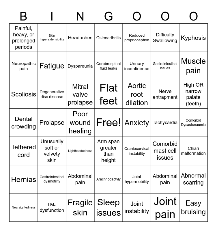 This bingo card has a free space and 48 words: Joint hypermobility, Gastrointestinal issues, Sleep issues, Prolapse, Mitral valve prolapse, Comorbid Dysautonaumia, Skin hyperextensibility, TMJ dysfunction, Difficulty Swallowing, Arm span greater than height, Kyphosis, Osteoarthritis, Nerve entrapment, Aortic root dilation, Hernias, Tachycardia, Neuropathic pain, Muscle pain, Abdominal pain, Reduced proprioception, Urinary incontinence, Poor wound healing, Painful, heavy, or prolonged periods, Fatigue, Abnormal scarring, Dyspareunia, High OR narrow palate (teeth), Nearsightedness, Flat feet, Degenerative disc disease, Joint pain, Anxiety, Chiari malformation, Gastrointestinal dysmotility, Dental crowding, Craniocervical instability, Comorbid mast cell issues, Scoliosis, Lightheadedness, Abdominal pain, Tethered cord, Easy bruising, Headaches, Fragile skin, Cerebrospinal fluid leaks, Arachnodactyly, Unusually soft or velvety skin and Joint instability.