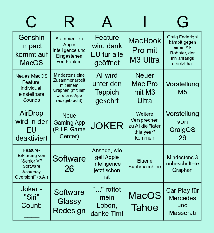 This bingo card has a free space and 24 words: Software 26, Software Glassy Redesign, AI wird unter den Teppich gekehrt, Joker - "Siri" Count: ____, Craig Federighi kämpft gegen einen AI-Roboter, der ihn anfangs ersetzt hat, Genshin Impact kommt auf MacOS, Neues MacOS Feature: individuell einstellbare Sounds, Statement zu Apple Intelligence und Eingestehen von Fehlern, Weitere Versprechen zu AI die "later this year" kommen, Ansage, wie geil Apple Intelligence jetzt schon ist, Neuer Mac Pro mit M3 Ultra, AirDrop wird in der EU deaktiviert, Eigene Suchmaschine, Mindestens 3 unbeschriftete Graphen, Mindestens eine Zusammenarbeit mit einem Graphen (mit ihm wird eine App rausgebracht), MacOS Tahoe, Vorstellung von CraigOS 26, Feature wird dank EU für alle geöffnet, Vorstellung M5, Neue Gaming App (R.I.P. Game Center), Car Play für Mercedes und Masserati, Feature-Erklärung von "Senior VP Software Accuracy Oversight" (o.Ä.), MacBook Pro mit M3 Ultra and "..." rettet mein Leben, danke Tim!.