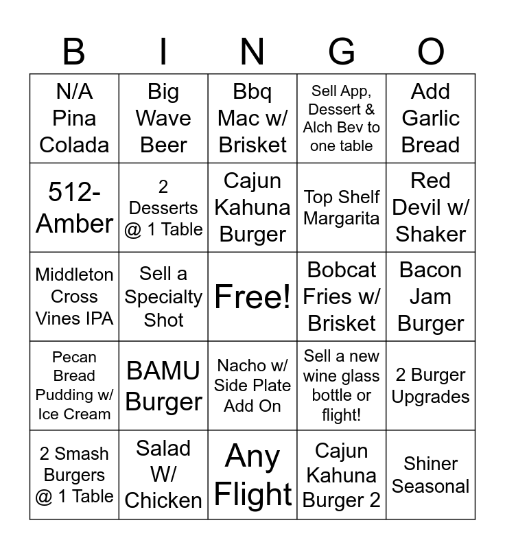 This bingo card has a free space and 24 words: BAMU Burger, Salad W/ Chicken, Cajun Kahuna Burger, 2 Smash Burgers @ 1 Table, Add Garlic Bread, N/A Pina Colada, 512-Amber, Big Wave Beer, Bobcat Fries w/ Brisket, Nacho w/ Side Plate Add On, Top Shelf Margarita, Middleton Cross Vines IPA, Sell a new wine glass bottle or flight!, 2 Burger Upgrades, 2 Desserts @ 1 Table, Cajun Kahuna Burger 2, Bacon Jam Burger, Bbq Mac w/ Brisket, Red Devil w/ Shaker, Sell a Specialty Shot, Shiner Seasonal, Pecan Bread Pudding w/ Ice Cream, Sell App, Dessert & Alch Bev to one table and Any Flight.