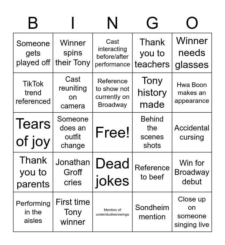 This bingo card has a free space and 40 words: Tony bingo, Tears of joy, Importance of new musicals mentioned, Cast reuniting on camera, First time Tony winner, Dead jokes, Reference to show not currently on Broadway, LMM mentioned, Winner needs glasses, Thank you to parents, Someone does an outfit change, Thank you to teachers, Close up on someone singing live, Accidental cursing, Behind the scenes shots, Jonathan Groff cries, "It's good to be back at Radio City", Someone gets played off, Someone wins multiple Tonys, Cast interacting before/after performance, Win for Broadway debut, Sondheim mention, Tony history made, TikTok trend referenced, Standing ovation, Cynthia "holds space", Someone mentions the Wicked movie, Steadycam shot, Awkward audience banter, Mentioning the kids at home, A plant in the audience, Performing in the aisles, Reference to Patti, Reference to beef, Hwa Boon makes an appearance, Mention of understudies/swings, Mic problems, Presenter screws up, Winner spins their Tony and Funny nomination close-up.