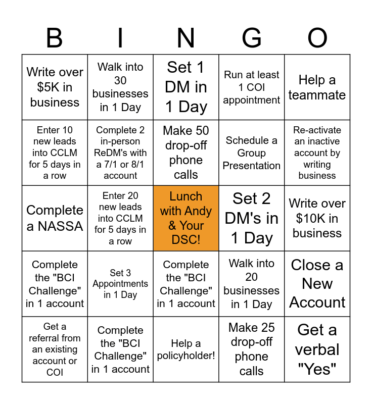 This bingo card has a free space and 24 words: Set 3 Appointments in 1 Day, Complete the "BCI Challenge" in 1 account, Make 50 drop-off phone calls, Get a referral from an existing account or COI, Help a teammate, Write over $5K in business, Enter 10 new leads into CCLM for 5 days in a row, Walk into 30 businesses in 1 Day, Set 2 DM's in 1 Day, Complete the "BCI Challenge" in 1 account, Schedule a Group Presentation, Complete a NASSA, Walk into 20 businesses in 1 Day, Close a New Account, Complete 2 in-person ReDM's with a 7/1 or 8/1 account, Make 25 drop-off phone calls, Write over $10K in business, Set 1 DM in 1 Day, Re-activate an inactive account by writing business, Enter 20 new leads into CCLM for 5 days in a row, Get a verbal "Yes", Complete the "BCI Challenge" in 1 account, Run at least 1 COI appointment and Help a policyholder!.