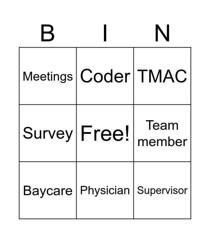 This bingo card has a free space and 9 words: Baycare, TMAC, Coder, Survey, Meetings, Team member, Supervisor, Hospital and Physician.