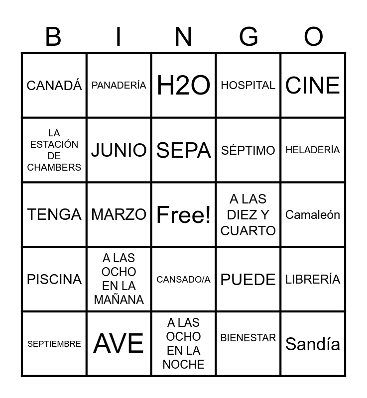 This bingo card has a free space and 29 words: SEPTIEMBRE, DICIEMBRE, MARZO, EL OXÍGENO, CANADÁ, H2O, JUNIO, A LAS OCHO EN LA MAÑANA, A LAS DIEZ Y CUARTO, AVE, Camaleón, Sandía, A LAS OCHO EN LA NOCHE, BIENESTAR, HELADERÍA, CARTERO, CANSADO/A, PISCINA, CINE, TENGA, PUEDE, CANTE, SÉPTIMO, LA ESTACIÓN DE CHAMBERS, HOSPITAL, PANADERÍA, LIBRERÍA, SEPA and HA COMIDO.
