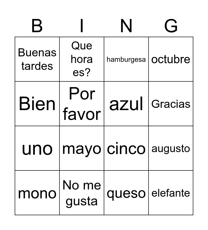 This bingo card has 24 words: Hola, Adios, Gracias, Como estas?, Bien, Buenas tardes, Por favor, Que hora es?, No me gusta, Me llamo, uno, cinco, diez, rojo, azul, cafe, queso, hamburgesa, mayo, augusto, mono, elefante, octubre and quince.