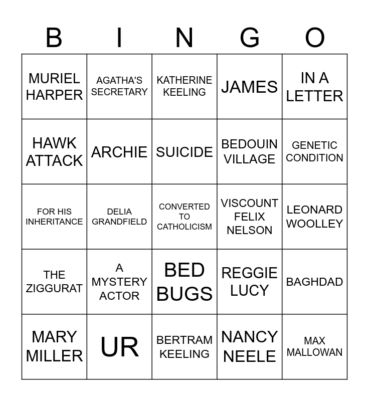 This bingo card has a free space and 29 words: MARY MILLER, NANCY NELSON, DELIA GRANDFIELD, BOARDING SCHOOL, MURIEL HARPER, KATHERINE KEELING, ARCHIE, A MYSTERY ACTOR, VISCOUNT FELIX NELSON, UR, LEONARD WOOLLEY, MAX MALLOWAN, BERTRAM KEELING, NANCY NEELE, GENETIC CONDITION, TIGRIS PALACE HOTEL, BED BUGS, THE ZIGGURAT, IN A LETTER, FOR HIS INHERITANCE, REGGIE LUCY, PUERPERAL FEVER, BEDOUIN VILLAGE, HAWK ATTACK, JAMES, AGATHA'S SECRETARY, BAGHDAD, SUICIDE and DEACON.