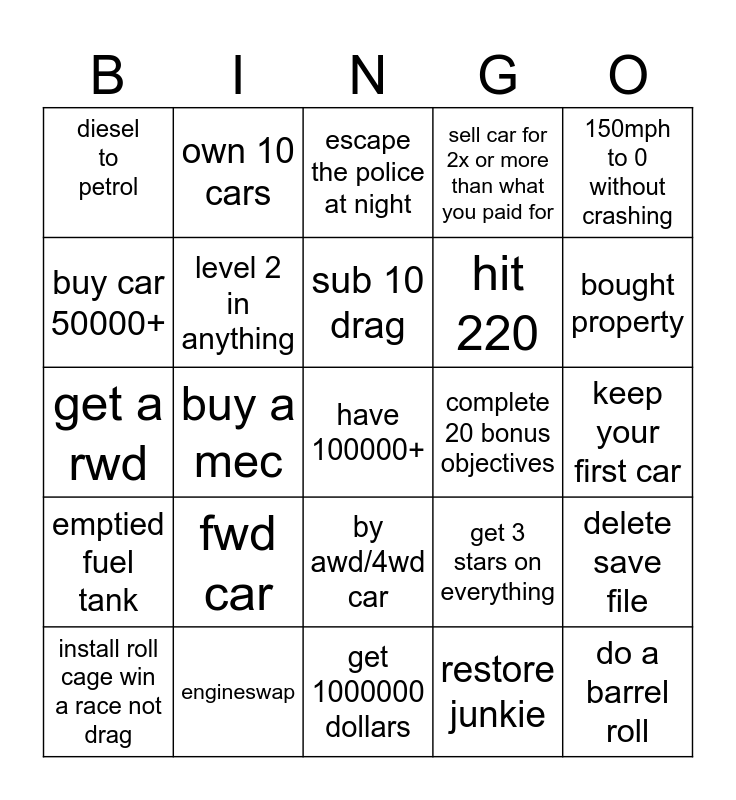 This bingo card has a free space and 24 words: fwd car, engineswap, sub 10 drag, install roll cage win a race not drag, 150mph to 0 without crashing, diesel to petrol, buy car 50000+, own 10 cars, complete 20 bonus objectives, by awd/4wd car, hit 220, get a rwd, get 3 stars on everything, delete save file, level 2 in anything, restore junkie, keep your first car, escape the police at night, bought property, buy a mec, do a barrel roll, emptied fuel tank, sell car for 2x or more than what you paid for and get 1000000 dollars.