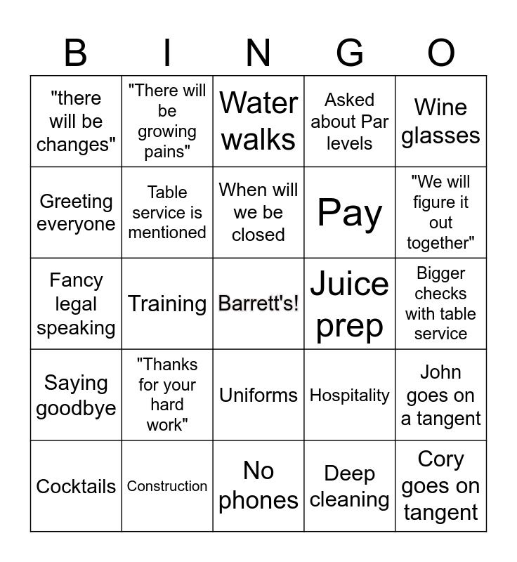 This bingo card has a free space and 24 words: "Thanks for your hard work", Construction, When will we be closed, Cocktails, Wine glasses, "there will be changes", Greeting everyone, "There will be growing pains", Juice prep, Uniforms, Pay, Fancy legal speaking, Hospitality, John goes on a tangent, Table service is mentioned, Deep cleaning, Bigger checks with table service, Water walks, "We will figure it out together", Training, Cory goes on tangent, Saying goodbye, Asked about Par levels and No phones.