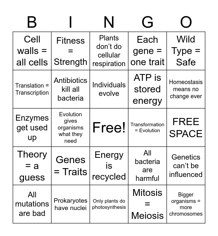 This bingo card has a free space and 24 words: Genes = Traits, Prokaryotes have nuclei, Individuals evolve, All mutations are bad, Wild Type = Safe, Cell walls = all cells, Translation = Transcription, Fitness = Strength, Transformation = Evolution, Energy is recycled, ATP is stored energy, Enzymes get used up, All bacteria are harmful, Genetics can’t be influenced, Antibiotics kill all bacteria, Mitosis = Meiosis, FREE SPACE, Plants don’t do cellular respiration, Homeostasis means no change ever, Evolution gives organisms what they need, Bigger organisms = more chromosomes, Theory = a guess, Each gene = one trait and Only plants do photosynthesis.