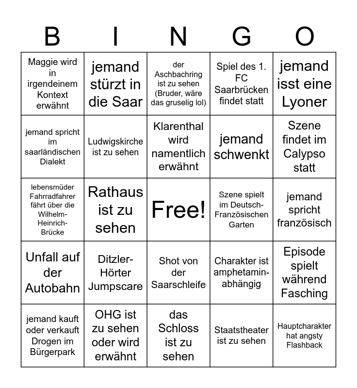 This bingo card has a free space and 24 words: Ditzler-Hörter Jumpscare, OHG ist zu sehen oder wird erwähnt, Klarenthal wird namentlich erwähnt, jemand kauft oder verkauft Drogen im Bürgerpark, jemand isst eine Lyoner, Maggie wird in irgendeinem Kontext erwähnt, jemand spricht im saarländischen Dialekt, jemand stürzt in die Saar, Szene spielt im Deutsch-Französischen Garten, Shot von der Saarschleife, jemand schwenkt, lebensmüder Fahrradfahrer fährt über die Wilhelm-Heinrich-Brücke, Charakter ist amphetamin-abhängig, Episode spielt während Fasching, Ludwigskirche ist zu sehen, Staatstheater ist zu sehen, jemand spricht französisch, der Aschbachring ist zu sehen (Bruder, wäre das gruselig lol), Szene findet im Calypso statt, Rathaus ist zu sehen, Hauptcharakter hat angsty Flashback, Unfall auf der Autobahn, Spiel des 1. FC Saarbrücken findet statt and das Schloss ist zu sehen.
