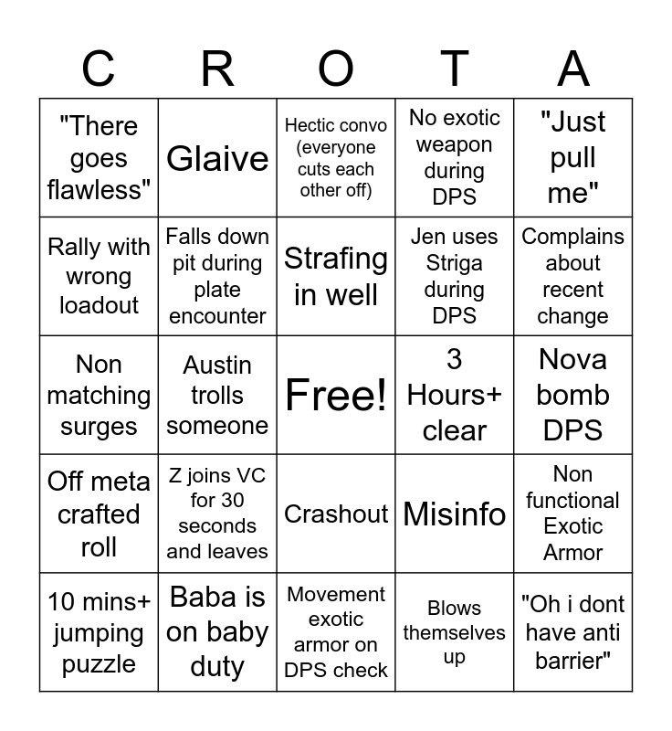 This bingo card has a free space and 55 words: Kenny's mic is muted, 10 mins+ jumping puzzle, Double primary, "There goes flawless", Movement exotic armor on DPS check, Blames the game, Falls down pit during plate encounter, Kenny mentions FF Tactics, Jen uses Striga during DPS, Life rant, No exotic weapon during DPS, Brin says "Wipe for DMG?", Raid exotic drop, "Enrage is near", PvP Weapon roll, "There goes flawless", "Just pull me", Austin trolls someone, "Need refresher", "Oh i dont have anti barrier", 3 Hours+ clear, Wiffs super completely, Misinfo, Hectic convo (everyone cuts each other off), D1 nostalgia, Strafing in well, Blows themselves up, Caster frame sword, Nova bomb DPS, Non functional Exotic Armor, 10k or more kill tracker, Eating on mic, "Ill add clear", Oversoul not broken in time, Rally with wrong loadout, Non matching surges, Roaming super DPS, Off meta crafted roll, Thunderlord, Austin makes a joke and nobody laughs, Glaive, Brin talks about, "LOTRO", Mario joins VC and makes fun of Brin, Z joins VC for 30 seconds and leaves, Baba is on baby duty, Deepsight f'ed up, IRL lore, Jen sings random song, Complains about recent change, Dredgen title, Drip is just not it, Edge of Fate Banter, Crashout and AFK during Encounter.