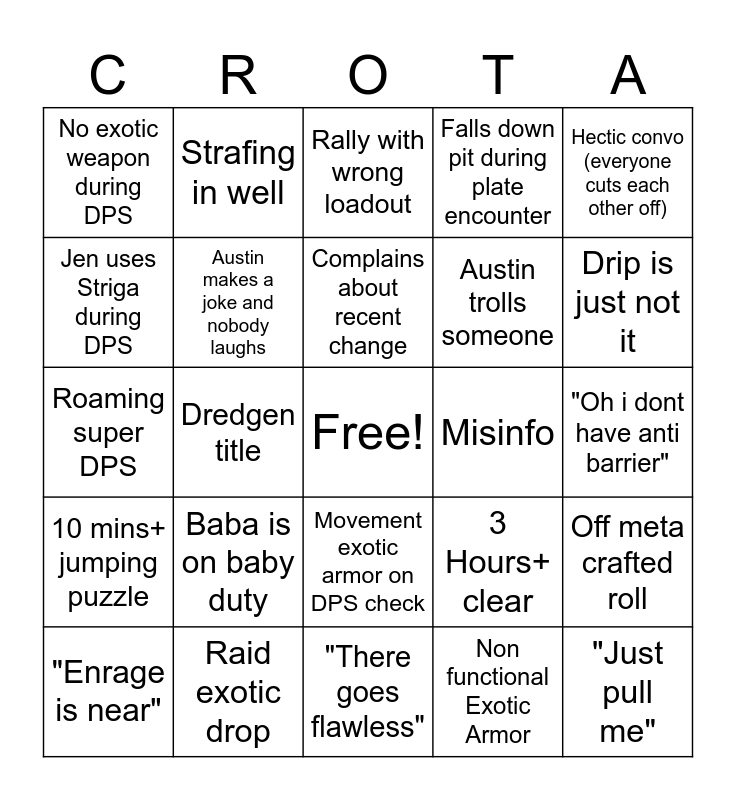 This bingo card has a free space and 54 words: Kenny's mic is muted, 10 mins+ jumping puzzle, Double primary, "There goes flawless", Movement exotic armor on DPS check, Blames the game, Falls down pit during plate encounter, Kenny mentions FF Tactics, Jen uses Striga during DPS, Life rant, No exotic weapon during DPS, Brin says "Wipe for DMG?", Raid exotic drop, "Enrage is near", PvP Weapon roll, "There goes flawless", "Just pull me", Austin trolls someone, "Need refresher", "Oh i dont have anti barrier", 3 Hours+ clear, Wiffs super completely, Misinfo, Hectic convo (everyone cuts each other off), D1 nostalgia, Strafing in well, Blows themselves up, Caster frame sword, Nova bomb DPS, Non functional Exotic Armor, 10k or more kill tracker, Eating on mic, "Ill add clear", Oversoul not broken in time, Rally with wrong loadout, Non matching surges, Roaming super DPS, Off meta crafted roll, Thunderlord, Austin makes a joke and nobody laughs, Glaive, Brin talks about "LOTRO", Mario joins VC and makes fun of Brin, Z joins VC for 30 seconds and leaves, Baba is on baby duty, Deepsight f'ed up, IRL lore, Jen sings random song, Complains about recent change, Dredgen title, Drip is just not it, Edge of Fate Banter, Crashout and AFK during Encounter.