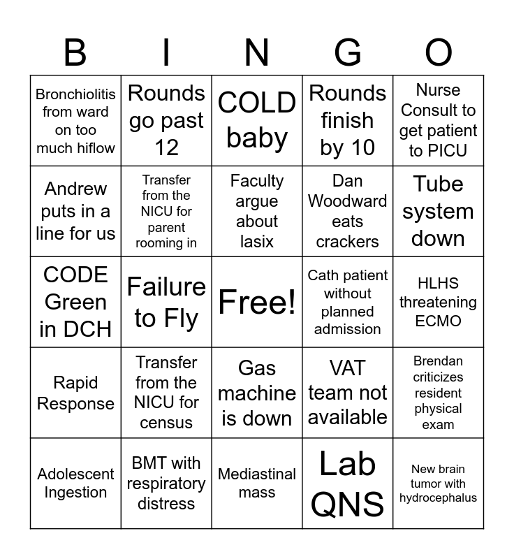 This bingo card has a free space and 29 words: Adolescent Ingestion, DKA, Failure to Fly, Bronchiolitis from outside, Bronchiolitis from ward on too much hiflow, COLD baby, Transfer from the NICU for parent rooming in, Transfer from the NICU for census, Cath patient without planned admission, BMT with respiratory distress, HLHS threatening ECMO, New brain tumor with hydrocephalus, Mediastinal mass, Lab QNS, Tube system down, Hemolysed specimen, Gas machine is down, Rapid Response, Nurse Consult to get patient to PICU, CODE Green in DCH, VAT team not available, MRI scheduling snafu, Dan Woodward eats crackers, Andrew puts in a line for us, Rounds finish by 10, Rounds go past 12, Brendan criticizes resident physical exam, Faculty argue about lasix and Nobody wants to own the patieint.