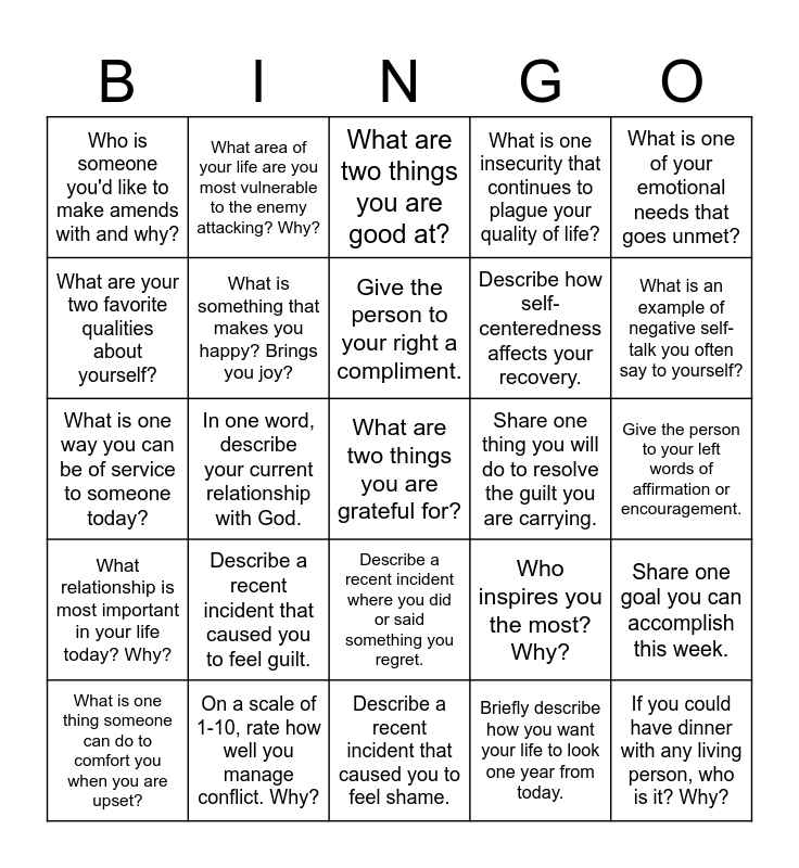 This bingo card has a free space and 24 words: Describe a recent incident that caused you to feel guilt., On a scale of 1-10, rate how well you manage conflict. Why?, Give the person to your right a compliment., What is one thing someone can do to comfort you when you are upset?, What is one of your emotional needs that goes unmet?, Who is someone you'd like to make amends with and why?, What are your two favorite qualities about yourself?, What area of your life are you most vulnerable to the enemy attacking? Why?, Share one thing you will do to resolve the guilt you are carrying., Describe a recent incident where you did or said something you regret., Describe how self-centeredness affects your recovery., What is one way you can be of service to someone today?, Who inspires you the most? Why?, Share one goal you can accomplish this week., What is something that makes you happy? Brings you joy?, Briefly describe how you want your life to look one year from today., Give the person to your left words of affirmation or encouragement., What are two things you are good at?, What is an example of negative self-talk you often say to yourself?, In one word, describe your current relationship with God., If you could have dinner with any living person, who is it? Why?, What relationship is most important in your life today? Why?, What is one insecurity that continues to plague your quality of life? and Describe a recent incident that caused you to feel shame..
