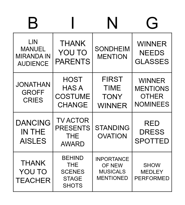 This bingo card has 16 words: BEHIND THE SCENES STAGE SHOTS, RED DRESS SPOTTED, SONDHEIM MENTION, LIN MANUEL MIRANDA IN AUDIENCE, DANCING IN THE AISLES, THANK YOU TO PARENTS, STANDING OVATION, INPORTANCE OF NEW MUSICALS MENTIONED, JONATHAN GROFF CRIES, HOST HAS A COSTUME CHANGE, THANK YOU TO TEACHER, WINNER NEEDS GLASSES, TV ACTOR PRESENTS THE AWARD, WINNER MENTIONS OTHER NOMINEES, FIRST TIME TONY WINNER and SHOW MEDLEY PERFORMED.