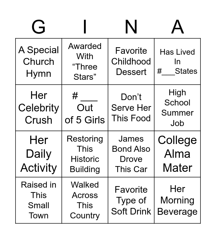 This bingo card has 16 words: Walked Across This Country, College Alma Mater, Favorite Childhood Dessert, A Special Church Hymn, Her Daily Activity, Awarded With “Three Stars”, James Bond Also Drove This Car, Favorite Type of Soft Drink, Her Celebrity Crush, # ___ Out of 5 Girls, Raised in This Small Town, Has Lived In #___States, Restoring This Historic Building, High School Summer Job, Don’t Serve Her This Food and Her Morning Beverage.