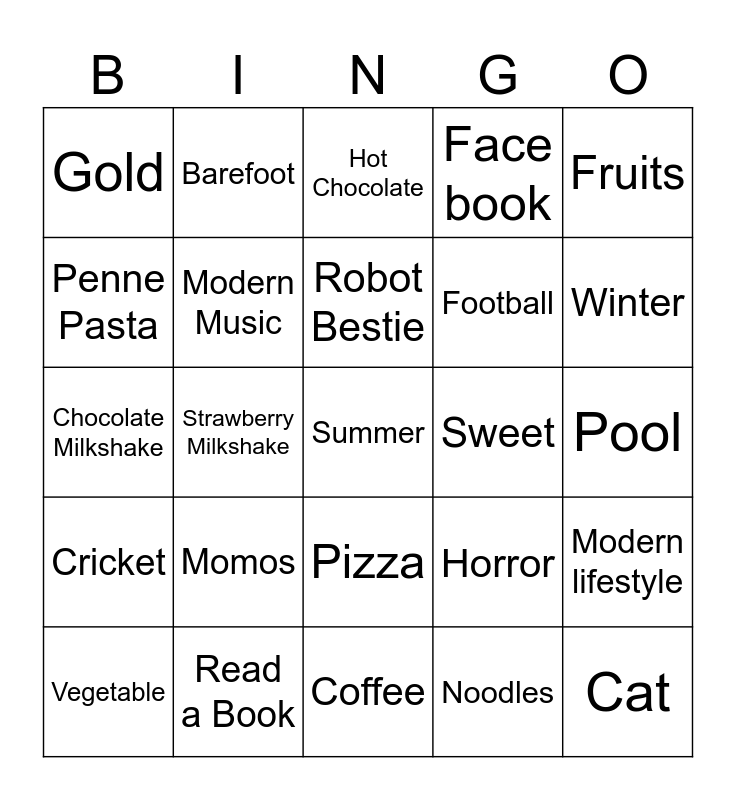 This bingo card has 50 words: Dog, Summer, Camping, Coffee, Momos, Day, Barefoot, Camper Van, Penne Pasta, Watch a Movie, Modern Music, Face book, Modern lifestyle, Horror, Beach, Invisibilty, Robot Bestie, Sweet, Water, Fruits, Strawberry Milkshake, Noodles, Gold, Football, Plane, Cat, Winter, Resort, Hot Chocolate, Pizza, Night, Shoes, House, Spagetti Pasta, Read a Book, Classic music, Instagram, Traditional Lifestyle, Comedy, Pool, Flying, Alien Bestie, Spicy, Juice, Vegetable, Chocolate Milkshake, Fried Rice, Silver, Cricket and Ship.