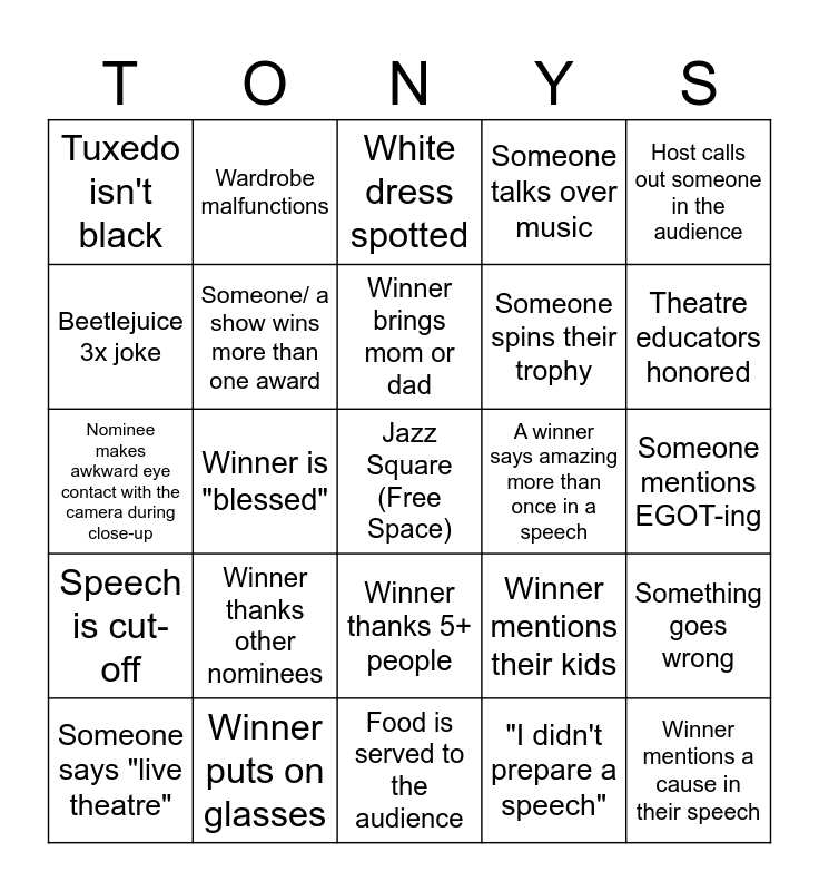 This bingo card has a free space and 24 words: Winner thanks other nominees, Winner puts on glasses, Winner brings mom or dad, Someone says "live theatre", Host calls out someone in the audience, Tuxedo isn't black, Beetlejuice 3x joke, Wardrobe malfunctions, A winner says amazing more than once in a speech, Winner thanks 5+ people, Someone spins their trophy, Nominee makes awkward eye contact with the camera during close-up, Winner mentions their kids, Something goes wrong, Someone/ a show wins more than one award, "I didn't prepare a speech", Someone mentions EGOT-ing, White dress spotted, Theatre educators honored, Winner is "blessed", Winner mentions a cause in their speech, Speech is cut-off, Someone talks over music and Food is served to the audience.