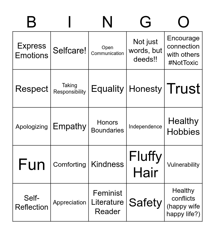 This bingo card has 25 words: Comforting, Feminist Literature Reader, Equality, Self-Reflection, Encourage connection with others #NotToxic, Express Emotions, Respect, Selfcare!, Independence, Kindness, Honesty, Apologizing, Fluffy Hair, Vulnerability, Taking Responsibility, Healthy conflicts (happy wife happy life?), Healthy Hobbies, Open Communication, Trust, Empathy, Honors Boundaries, Appreciation, Fun, Not just words, but deeds!! and Safety.