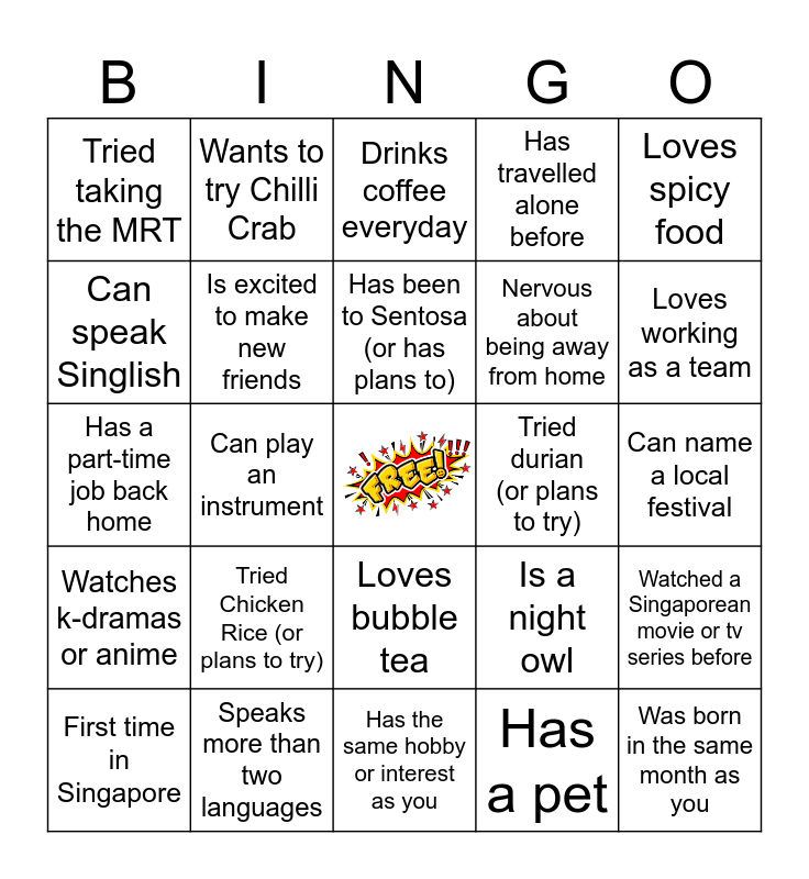 This bingo card has a free space and 24 words: Tried Chicken Rice (or plans to try), Speaks more than two languages, Has been to Sentosa (or has plans to), First time in Singapore, Loves spicy food, Tried taking the MRT, Can speak Singlish, Wants to try Chilli Crab, Tried durian (or plans to try), Loves bubble tea, Nervous about being away from home, Has a part-time job back home, Is a night owl, Watched a Singaporean movie or tv series before, Is excited to make new friends, Has a pet, Can name a local festival, Drinks coffee everyday, Loves working as a team, Can play an instrument, Was born in the same month as you, Watches k-dramas or anime, Has travelled alone before and Has the same hobby or interest as you.