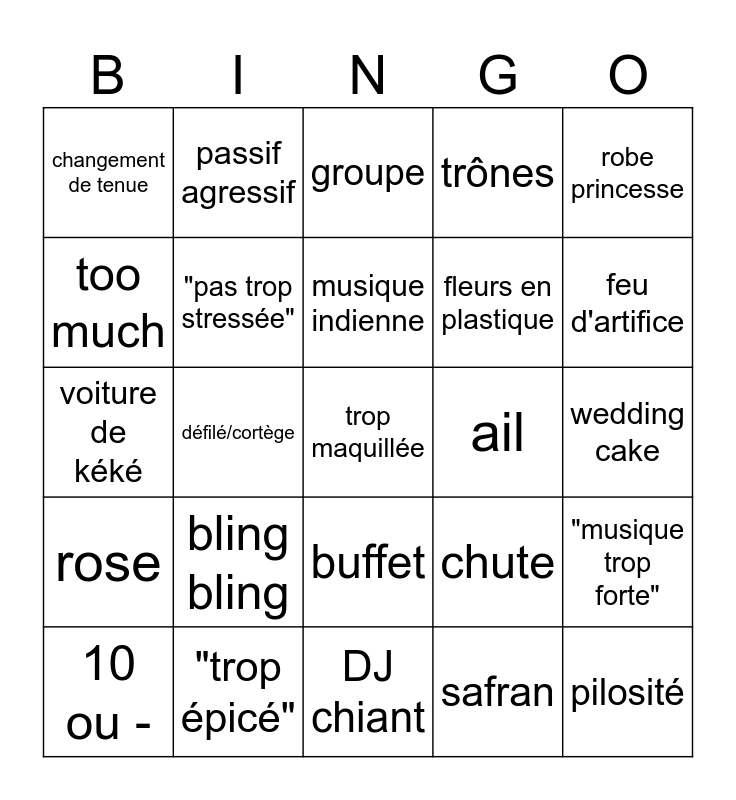This bingo card has a free space and 24 words: bling bling, "trop épicé", musique indienne, 10 ou -, robe princesse, changement de tenue, too much, passif agressif, ail, buffet, fleurs en plastique, voiture de kéké, chute, "musique trop forte", "pas trop stressée", safran, wedding cake, groupe, feu d'artifice, défilé/cortège, pilosité, rose, trônes and DJ chiant.