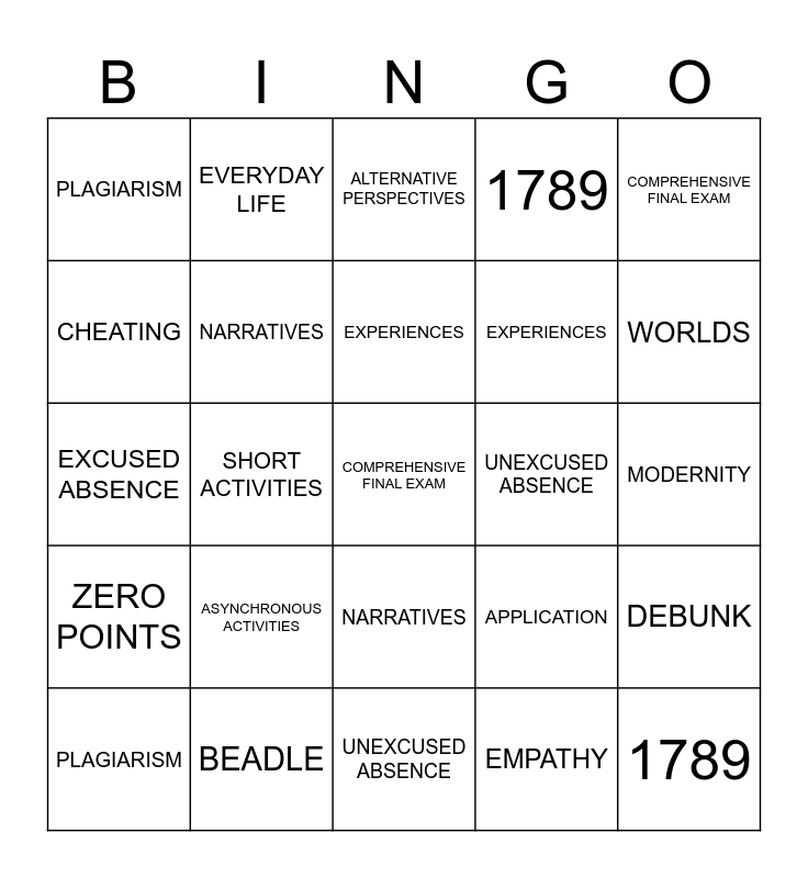 ⚠ This card has duplicate items: MODERNITY (2), MEDICAL CERTIFICATE (2), NO NEGOTIATION OF GRADES (2), BEADLE (2), CHEATING (2), 1789 (2), ASYNCHRONOUS ACTIVITIES (2), COMPREHENSIVE FINAL EXAM (2), UNLEARN (2), DEBUNK (2), QUIZ (2), PLAGIARISM (2), ALTERNATIVE PERSPECTIVES (2), ANNOUNCED QUIZZES (2), SHORT ACTIVITIES (2), NARRATIVES (2), EXPERIENCES (2), TAKEN FOR GRANTED (2), ZERO POINTS (2), UNEXCUSED ABSENCE (2), APPLICATION (2), WORLDS (2), INTERDISCIPLINARY (2), STRUCTURES (2), PARTICIPATE (2), EXCUSED ABSENCE (2), COMPASSION (2), EMPATHY (2), CRITICAL ATTITUDE (2), EVERYDAY LIFE (2), FORBID GAI (2), CANVAS INBOX (2), 5 MINS AFTER 2ND BELL (2)