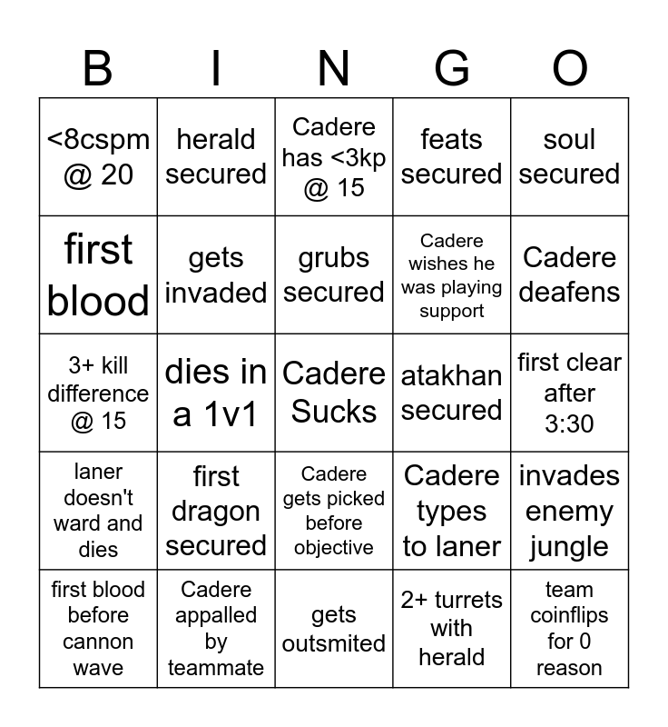 This bingo card has a free space and 37 words: jungle camp resets, fail flash, misses free kill, gets invaded, invades enemy jungle, first dragon secured, grubs secured, <7cspm @ 10, soul secured, fail ults, dies in a 1v1, feats secured, team coinflips for 0 reason, first clear after 3:30, first blood, laner doesn't ward and dies, team actually does something good, Cadere has <3kp @ 15, Cadere gets picked before objective, atakhan secured, <8cspm @ 20, Cadere deafens, first blood before cannon wave, gets outsmited, laner spam pings Cadere, 2+ turrets with herald, herald secured, "jungle diff", Cadere steals kill from laner, ults for 0 kills, 3+ ganks @ 15, Cadere appalled by teammate, 3+ kill difference @ 15, Cadere dies with flash up, Cadere types to laner, Cadere wishes he was playing support and Cadere full clears 3 times in a row.