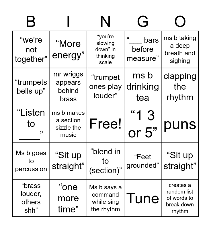This bingo card has a free space and 24 words: “Sit up straight”, “one more time”, “trumpet ones play louder”, “brass louder, others shh”, ms b taking a deep breath and sighing, “we’re not together”, “trumpets bells up”, “More energy”, “1 3 or 5”, “blend in to (section)”, ms b drinking tea, “Listen to ____”, “Feet grounded”, “Sit up straight”, mr wriggs appears behind brass, Tune, puns, “you’re slowing down” in thinking scale, clapping the rhythm, ms b makes a section sizzle the music, creates a random list of words to break down rhythm, Ms b goes to percussion, “___ bars before measure” and Ms b says a command while sing the rhythm.