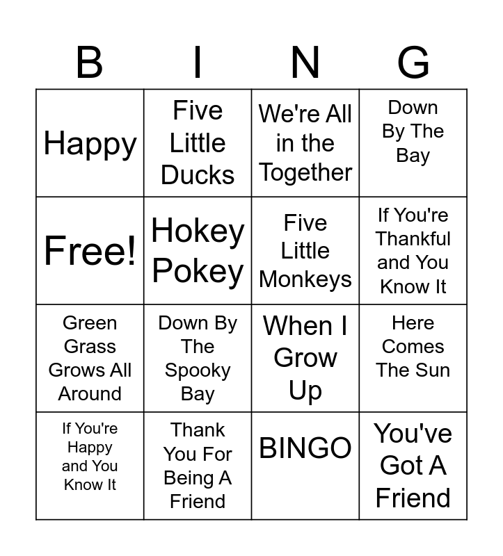 This bingo card has 16 words: Thank You For Being A Friend, Here Comes The Sun, We're All in the Together, Happy, Green Grass Grows All Around, Five Little Ducks, When I Grow Up, BINGO, Free!, Hokey Pokey, If You're Happy and You Know It, Down By The Bay, Down By The Spooky Bay, If You're Thankful and You Know It, Five Little Monkeys and You've Got A Friend.