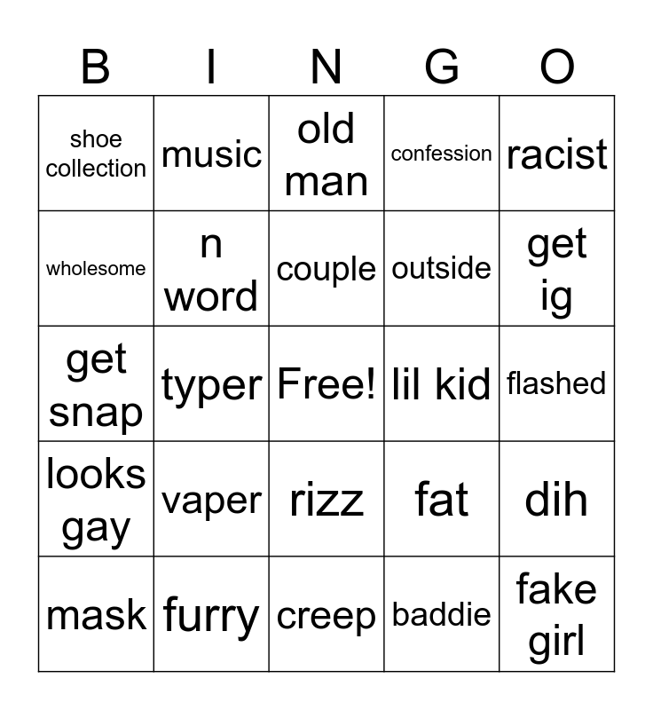 This bingo card has a free space and 24 words: vaper, furry, couple, mask, racist, shoe collection, wholesome, music, lil kid, rizz, outside, get snap, fat, dih, n word, baddie, flashed, old man, get ig, typer, fake girl, looks gay, confession and creep.