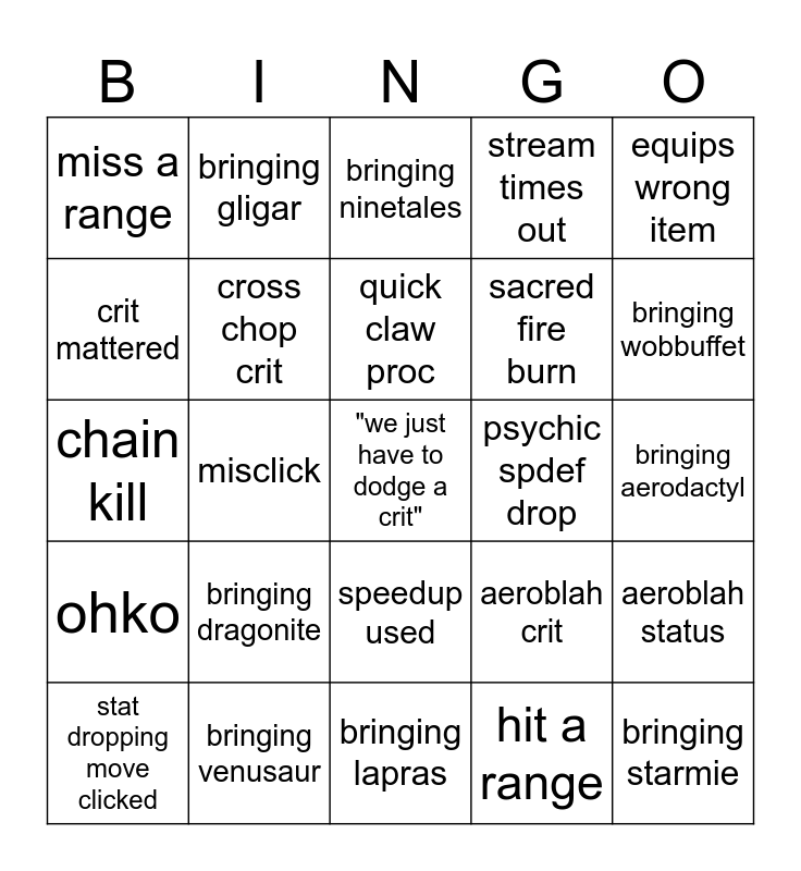 This bingo card has a free space and 52 words: bringing skarmory, bringing starmie, bringing a new mon, bringing lapras, bringing dragonite, muk switches, bringing gligar, crit didn't matter, crit mattered, rock slide flinch, cross chop crit, STALL, aeroblah status, aeroblah crit, AP boost, scizor boosts, quick claw proc, psychic spdef drop, HOO HAH, equips wrong item, misclick, hit a range, miss a range, sacred fire burn, extremespeed clicked, perish song, switch into random move, a move whiffs, bringing wobbuffet, mon gets paralysed, mon falls asleep, stream times out, bringing jolteon, bringing umbreon, bringing tyranitar, bringing ninetales, bringing venusaur, shadow ball def drop, mitigation quick claw, a TM is taught, berry eaten, bringing aerodactyl, ohko, opponent switches out, speedup used, o7 in chat, damage boosting item equipped, chain kill, a tear is shed, bringing a mon with a maxed stat, stat dropping move clicked and switching into a 4x resisted move.