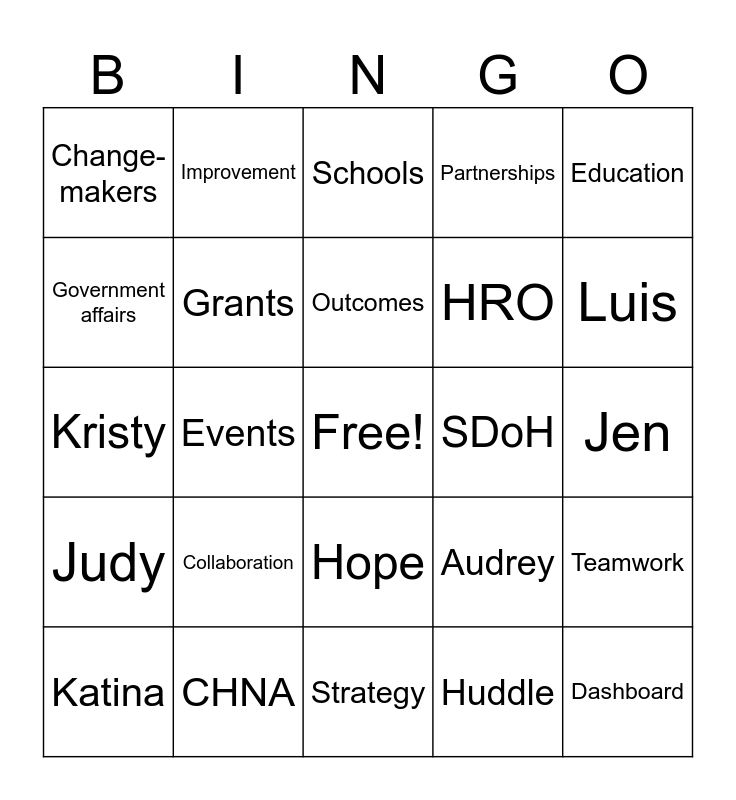 This bingo card has a free space and 33 words: Future, Carlisle, Events, Advocacy, Judy, Grants, Education, Katina, Improvement, Health, Outcomes, Schools, Youth, Community, SDoH, Luis, CHNA, Kristy, Collaboration, Audrey, Hope, Ambassador, Change-makers, Jen, Strategy, Dashboard, Partnerships, HRO, Government affairs, Teamwork, Social minded, Huddle and Data.
