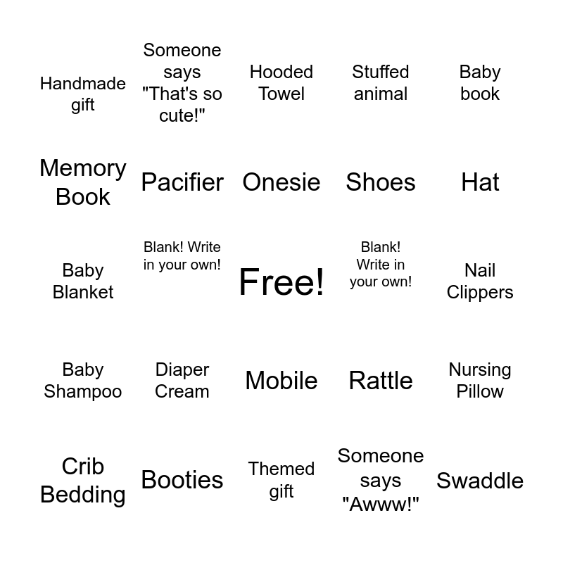 This bingo card has a free space and 24 words: Diaper Cream, Booties, Onesie, Crib Bedding, Baby book, Handmade gift, Memory Book, Someone says "That's so cute!", Blank! Write in your own!, Mobile, Shoes, Baby Blanket, Rattle, Nursing Pillow, Pacifier, Someone says "Awww!", Nail Clippers, Hooded Towel, Hat, Blank! Write in your own!, Swaddle, Baby Shampoo, Stuffed animal and Themed gift.