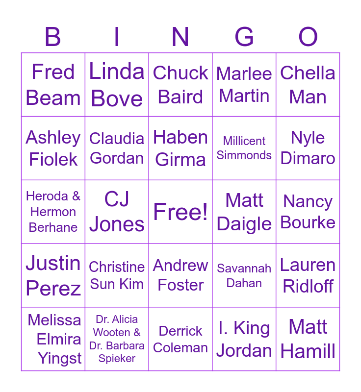 This bingo card has a free space and 24 words: Melissa Elmira Yingst, Christine Sun Kim, Haben Girma, I. King Jordan, Chella Man, Fred Beam, Linda Bove, Chuck Baird, Matt Daigle, Nancy Bourke, Heroda & Hermon Berhane, Claudia Gordan, Savannah Dahan, Lauren Ridloff, Ashley Fiolek, Dr. Alicia Wooten & Dr. Barbara Spieker, Derrick Coleman, Marlee Martin, Nyle Dimaro, Justin Perez, CJ Jones, Andrew Foster, Millicent Simmonds and Matt Hamill.