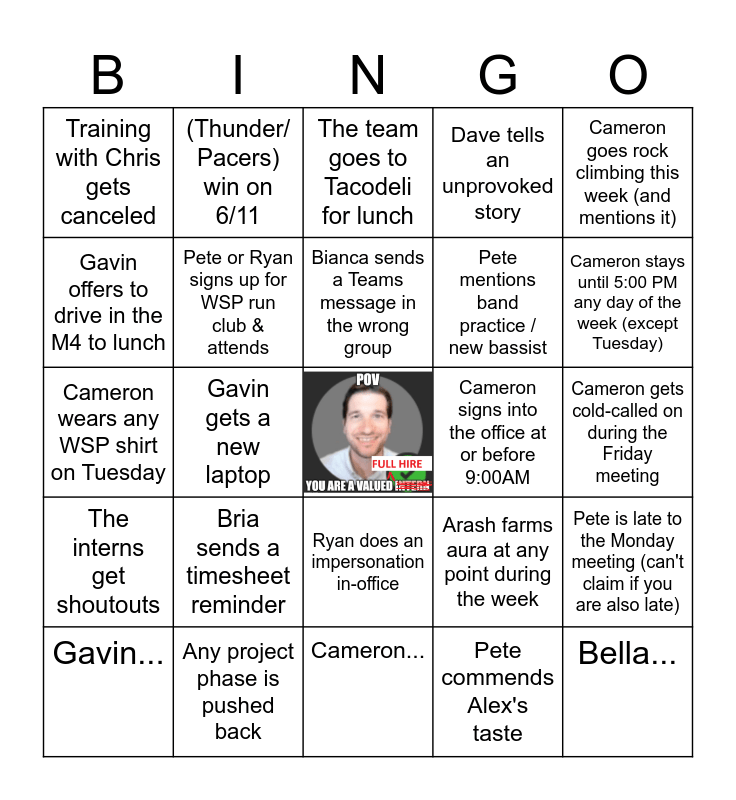 This bingo card has a free space and 24 words: Bria sends a timesheet reminder, Any project phase is pushed back, Bianca sends a Teams message in the wrong group, Gavin..., Cameron goes rock climbing this week (and mentions it), Training with Chris gets canceled, Gavin offers to drive in the M4 to lunch, (Thunder/ Pacers) win on 6/11, Cameron signs into the office at or before 9:00AM, Ryan does an impersonation in-office, Pete mentions band practice / new bassist, Cameron wears any WSP shirt on Tuesday, Arash farms aura at any point during the week, Pete is late to the Monday meeting (can't claim if you are also late), Pete or Ryan signs up for WSP run club & attends, Pete commends Alex's taste, Cameron gets cold-called on during the Friday meeting, The team goes to Tacodeli for lunch, Cameron stays until 5:00 PM any day of the week (except Tuesday), Gavin gets a new laptop, Bella..., The interns get shoutouts, Dave tells an unprovoked story and Cameron....