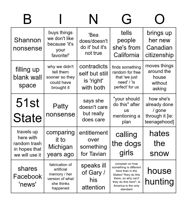 This bingo card has 25 words: comparing it to Michigan years ago, speaks ill of Gary / his attention, contradicts self but still is 'right' with both, shares Facebook 'news', brings up her new Canadian citizenship, Shannon nonsense, filling up blank wall space, buys things we don't like because 'it's your favorite!', "your should do this" after us mentioning a plan, entitlement over something for Tavian, finds something random for free that 'we just need' / 'is perfect' for us, 51st State, calling the dogs girls, hates the snow, why we didn't tell them sooner so they could have brought it, house hunting, how she's already done / gone through it [ie: teenagehood], 'Bea does/doesn't do it' but it's not true, moves things around the house without asking, Patty nonsense, says she doesn't care but really does care, fabrication of artificial memory / her version of what she thinks happened, travels up here with random trash in hopes that we will use it, tells people she's from California and complain on how something is different here than in the States! "they do this there, so why can't they do this here"; ie America is the only standard.