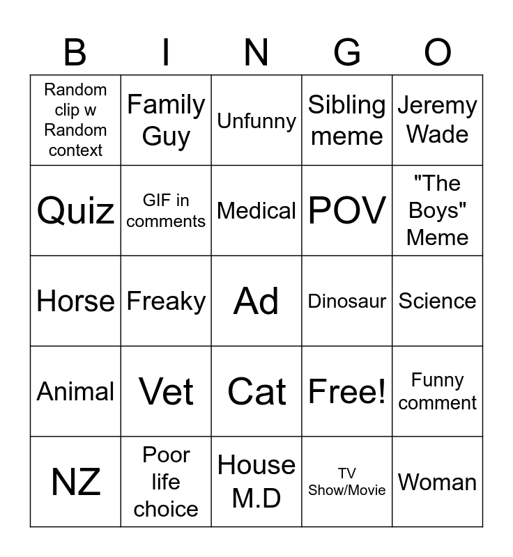 This bingo card has 25 words: Vet, House M.D, Medical, NZ, Jeremy Wade, Random clip w Random context, Quiz, Family Guy, Dinosaur, Cat, POV, Horse, Free!, Funny comment, GIF in comments, Woman, Science, Unfunny, "The Boys" Meme, Freaky, Ad, Poor life choice, Animal, Sibling meme and TV Show/Movie.