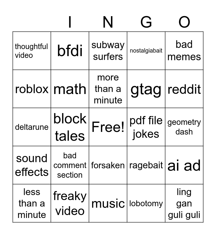 This bingo card has a free space and 24 words: bad comment section, freaky video, more than a minute, less than a minute, bad memes, thoughtful video, roblox, bfdi, pdf file jokes, forsaken, gtag, deltarune, ragebait, ai ad, math, lobotomy, geometry dash, subway surfers, reddit, block tales, ling gan guli guli, sound effects, nostalgiabait and music.