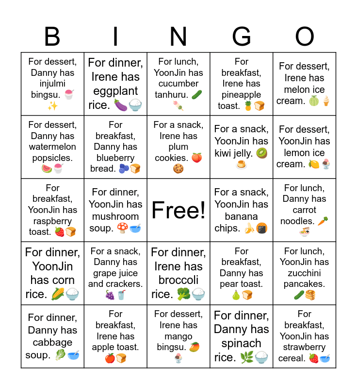 This bingo card has a free space and 30 words: For breakfast, Irene has apple toast. ๐๐, For lunch, Danny has tomato rice. ๐ ๐, For dinner, YoonJin has mushroom soup. ๐๐ฅฃ, For a snack, Irene has peach yogurt. ๐๐ฆ, For dessert, Danny has injulmi bingsu. ๐งโจ, For lunch, YoonJin has cucumber tanhuru. ๐ฅ๐ก, For breakfast, Danny has blueberry bread. ๐ซ๐, For dinner, Irene has broccoli rice. ๐ฅฆ๐, For a snack, YoonJin has banana chips. ๐๐, For dessert, Irene has mango bingsu. ๐ฅญ๐จ, For lunch, Danny has carrot noodles. ๐ฅ๐, For breakfast, YoonJin has strawberry cereal. ๐๐ฅฃ, For dinner, Danny has spinach rice. ๐ฟ๐, For a snack, Irene has cherry jelly. ๐๐ฎ, For dessert, YoonJin has lemon ice cream. ๐๐จ, For lunch, Irene has avocado sandwich. ๐ฅ๐ฅช, For breakfast, Danny has pear toast. ๐๐, For dinner, YoonJin has corn rice. ๐ฝ๐, For a snack, Danny has grape juice and crackers. ๐๐ฅค, For dessert, Irene has melon ice cream. ๐๐ฆ, For breakfast, YoonJin has raspberry toast. ๐๐, For lunch, Danny has bell pepper noodles. ๐ซ๐, For dinner, Irene has eggplant rice. ๐๐, For a snack, YoonJin has kiwi jelly. ๐ฅ๐ฎ, For dessert, Danny has watermelon popsicles. ๐๐ง, For breakfast, Irene has pineapple toast. ๐๐, For lunch, YoonJin has zucchini pancakes. ๐ฅ๐ฅ, For dinner, Danny has cabbage soup. ๐ฅฌ๐ฅฃ, For a snack, Irene has plum cookies. ๐๐ช and For dessert, YoonJin has orange gummies. ๐๐ฌ.