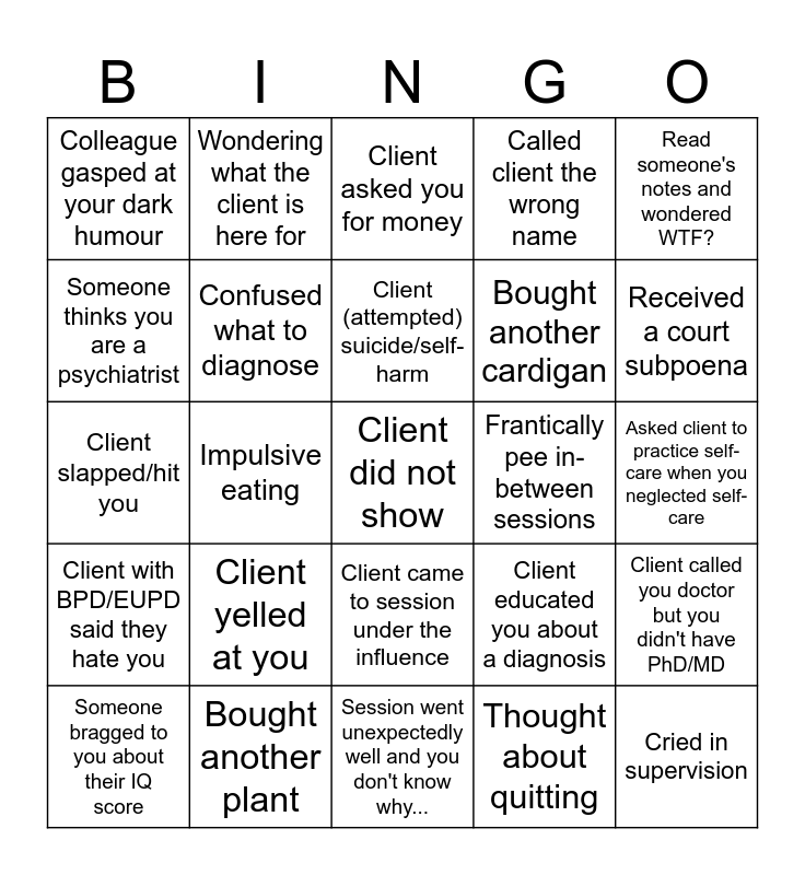 This bingo card has a free space and 35 words: Got off work restless, Received doorknob confession, Supervisor got a distress call during supervision, Confused what to diagnose, Client came to session under the influence, Called client the wrong name, Someone thinks you are a psychiatrist, Walked into an occupied therapy room, Client (attempted) suicide/self-harm, Witnessed a drug deal in the inpatient unit, Client slapped/hit you, Read someone's notes and wondered WTF?, Wondered if you are the one who has issues, Disagreement in the MDT, Colleague gasped at your dark humour, Frantically pee in-between sessions, Thought about quitting, Impulsive eating, Client with BPD/EUPD said they hate you, Cried in supervision, Client educated you about a diagnosis, Someone bragged to you about their IQ score, Client called you doctor but you didn't have PhD/MD, Bought another plant, Client asked you for money, Received a court subpoena, Client asked you for medication, Client asked you for a support letter for court, Bought another cardigan, Asked client to practice self-care when you neglected self-care, Pet interrupted a telehealth session, Session went unexpectedly well and you don't know why..., Client yelled at you, Wondering what the client is here for and Successfully discharged a client.