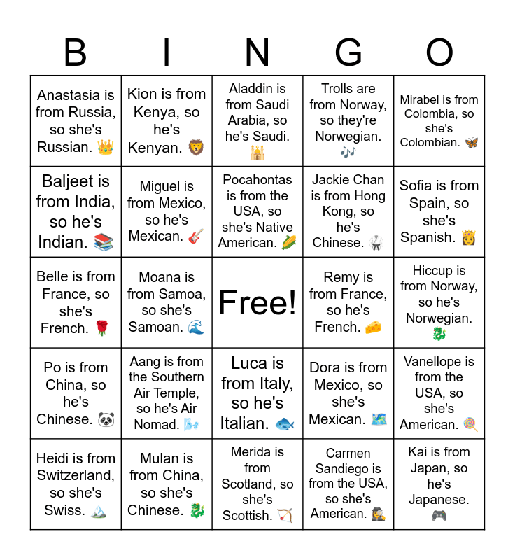 This bingo card has a free space and 30 words: Mulan is from China, so she's Chinese. ๐, Elsa is from Norway, so she's Norwegian. โ๏ธ, Moana is from Samoa, so she's Samoan. ๐, Paddington is from Peru, so he's Peruvian. ๐งธ, Anastasia is from Russia, so she's Russian. ๐, Aladdin is from Saudi Arabia, so he's Saudi. ๐, Miguel is from Mexico, so he's Mexican. ๐ธ, Luca is from Italy, so he's Italian. ๐, Remy is from France, so he's French. ๐ง, Merida is from Scotland, so she's Scottish. ๐น, Hiccup is from Norway, so he's Norwegian. ๐, Kai is from Japan, so he's Japanese. ๐ฎ, Carmen Sandiego is from the USA, so she's American. ๐ต๏ธโโ๏ธ, Shrek is from Scotland, so he's Scottish. ๐ง , Sofia is from Spain, so she's Spanish. ๐ธ, Raya is from the Philippines, so she's Filipino. ๐, Dora is from Mexico, so she's Mexican. ๐บ๏ธ, Po is from China, so he's Chinese. ๐ผ, Aang is from the Southern Air Temple, so he's Air Nomad. ๐ฌ๏ธ, Mirabel is from Colombia, so she's Colombian. ๐ฆ, Belle is from France, so she's French. ๐น, Tiana is from the USA, so she's American. ๐ธ, Kion is from Kenya, so he's Kenyan. ๐ฆ, Jackie Chan is from Hong Kong, so he's Chinese. ๐ฅ, Baljeet is from India, so he's Indian. ๐, Trolls are from Norway, so they're Norwegian. ๐ถ, Vanellope is from the USA, so she's American. ๐ญ, Heidi is from Switzerland, so she's Swiss. ๐๏ธ, Pocahontas is from the USA, so she's Native American. ๐ฝ and Ash Ketchum is from Japan, so he's Japanese. ๐.