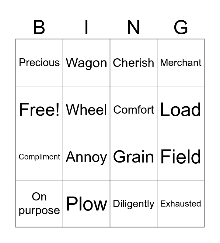 This bingo card has 16 words: Plow, Field, Cherish, Precious, Compliment, Wagon, Grain, Diligently, Free!, Wheel, On purpose, Merchant, Annoy, Load, Comfort and Exhausted.
