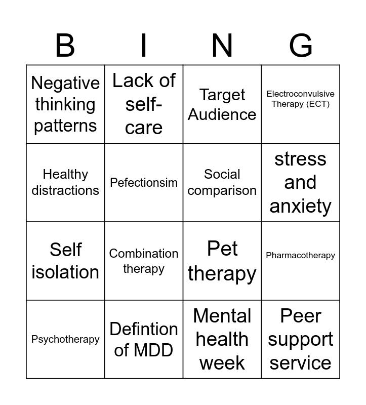 This bingo card has 16 words: Defintion of MDD, Pharmacotherapy, Target Audience, Negative thinking patterns, Self isolation, Lack of self-care, Pet therapy, Mental health week, Healthy distractions, Pefectionsim, Psychotherapy, Electroconvulsive Therapy (ECT), Combination therapy, stress and anxiety, Social comparison and Peer support service.
