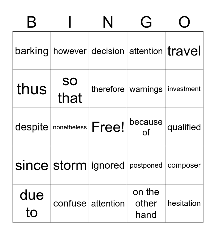 This bingo card has a free space and 40 words: generate, despite, photography, so that, confuse, ignored, therefore, in contrast, travel, since, nonetheless, attention, hesitation, qualified, because of, storm, although, barking, even though, decision, composer, on the other hand, warnings, thus, whereas, claims, as a result, while, nevertheless, instead, sculpture, due to, contest, postponed, investment, attention, in spite of, ignored, however and deadline.