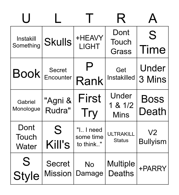 This bingo card has 25 words: S Kill's, No Damage, P Rank, S Style, S Time, Instakill Something, Book, Skulls, Under 1 & 1/2 Mins, "I.. I need some time to think..", Get Instakilled, Gabriel Monologue, ULTRAKILL Status, V2 Bullyism, Secret Encounter, +PARRY, Boss Death, +HEAVY LIGHT, Under 3 Mins, "Agni & Rudra", First Try, Secret Mission, Dont Touch Water, Dont Touch Grass and Multiple Deaths.