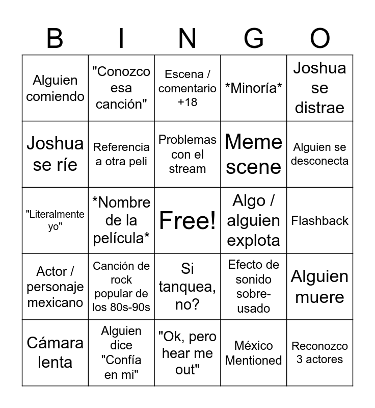 This bingo card has a free space and 24 words: Canción de rock popular de los 80s-90s, Alguien dice "Confía en mi", Problemas con el stream, Cámara lenta, Joshua se distrae, Alguien comiendo, Joshua se ríe, "Conozco esa canción", Algo / alguien explota, Si tanquea, no?, Meme scene, "Literalmente yo", Efecto de sonido sobre-usado, Alguien muere, Referencia a otra peli, México Mentioned, Flashback, Escena / comentario +18, Alguien se desconecta, *Nombre de la película*, Reconozco 3 actores, Actor / personaje mexicano, *Minoría* and "Ok, pero hear me out".