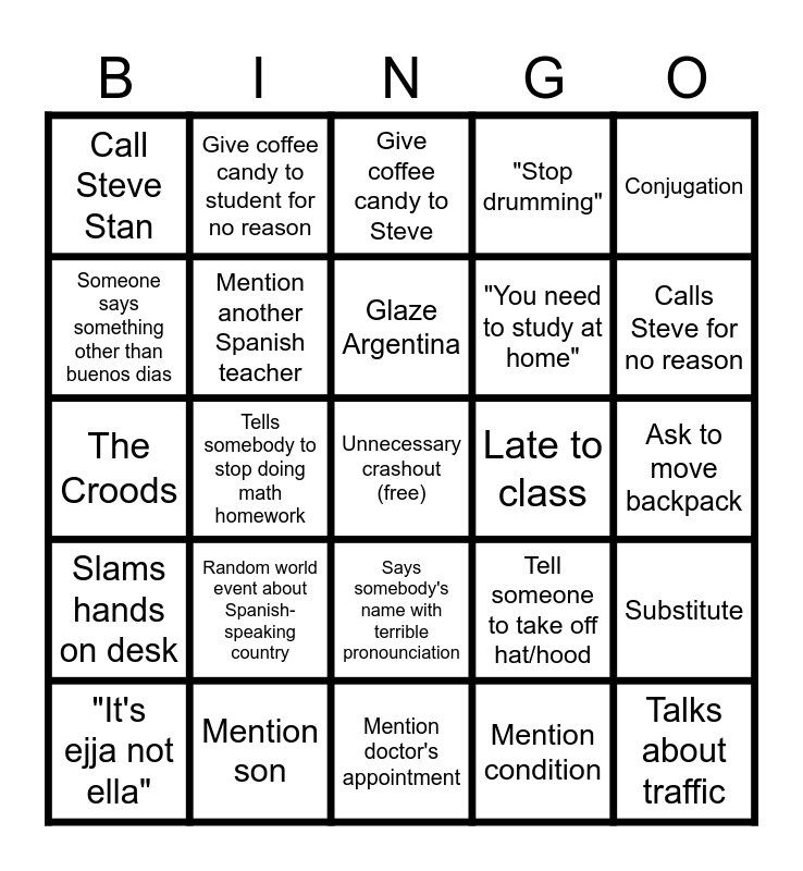 This bingo card has a free space and 24 words: Random world event about Spanish-speaking country, Mention son, Glaze Argentina, "It's ejja not ella", Conjugation, Call Steve Stan, Someone says something other than buenos dias, Give coffee candy to student for no reason, Late to class, Says somebody's name with terrible pronounciation, "You need to study at home", The Croods, Tell someone to take off hat/hood, Substitute, Mention another Spanish teacher, Mention condition, Ask to move backpack, Give coffee candy to Steve, Calls Steve for no reason, Tells somebody to stop doing math homework, Talks about traffic, Slams hands on desk, "Stop drumming" and Mention doctor's appointment.