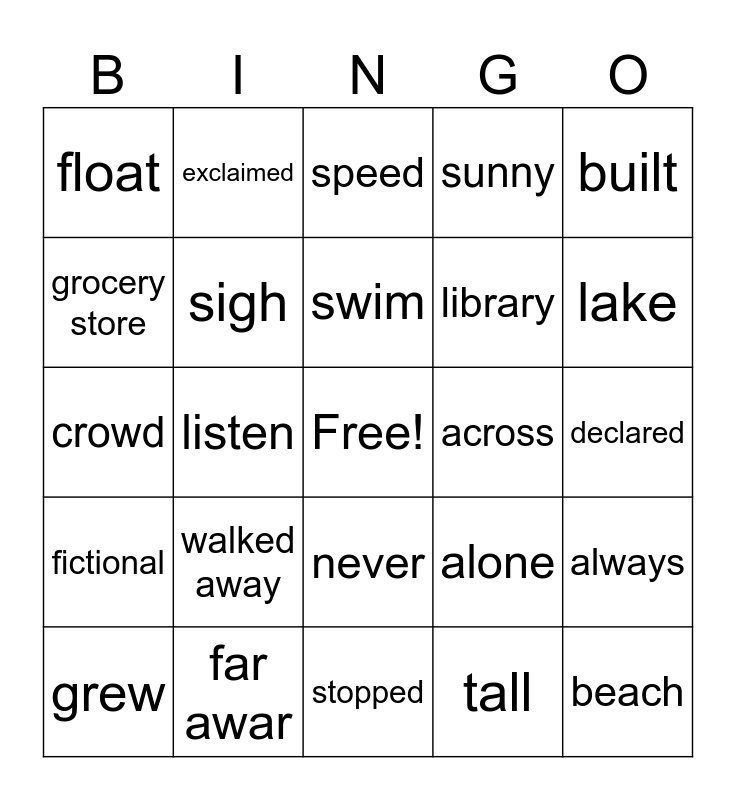This bingo card has a free space and 34 words: lie, tall, truth, stretching, fictional, sigh, built, grew, exclaimed, spunky, swim, speed, floated, prove, across, lake, far awar, crowd, walked away, alone, never, think, float, declared, stopped, beach, sunny, Saturday, library, grocery store, vegetables, listen, always and creating.