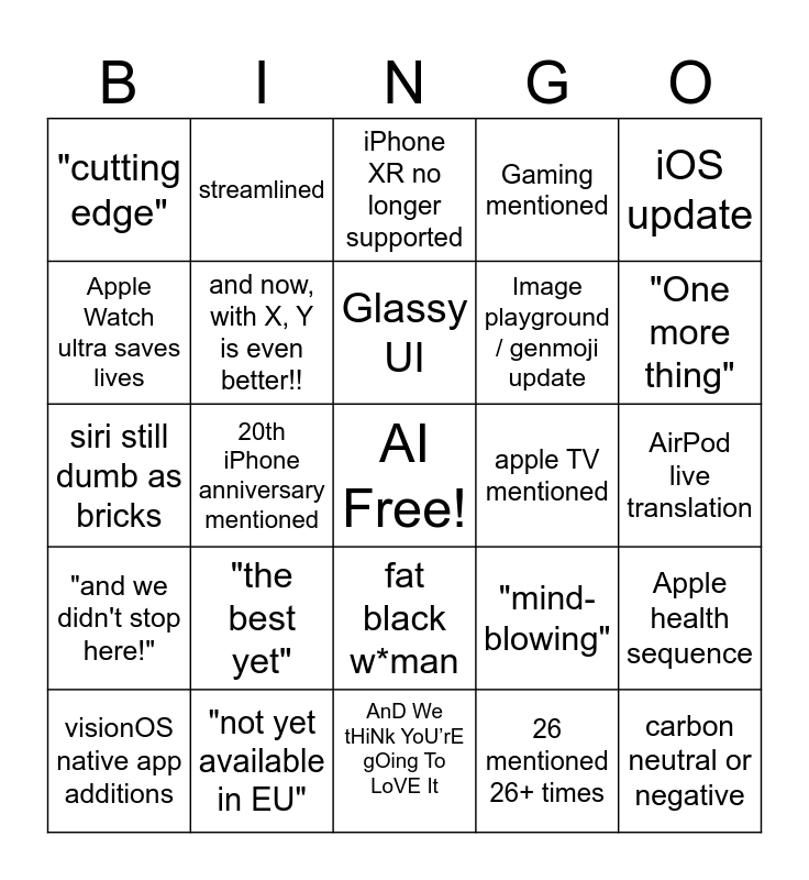 This bingo card has a free space and 24 words: "the best yet", "not yet available in EU", Glassy UI, visionOS native app additions, iOS update, "cutting edge", Apple Watch ultra saves lives, streamlined, apple TV mentioned, fat black w*man, Image playground / genmoji update, siri still dumb as bricks, "mind-blowing", Apple health sequence, and now, with X, Y is even better!!, 26 mentioned 26+ times, AirPod live translation, iPhone XR no longer supported, "One more thing", 20th iPhone anniversary mentioned, carbon neutral or negative, "and we didn't stop here!", Gaming mentioned and AnD We tHiNk YoU’rE gOing To LoVE It.