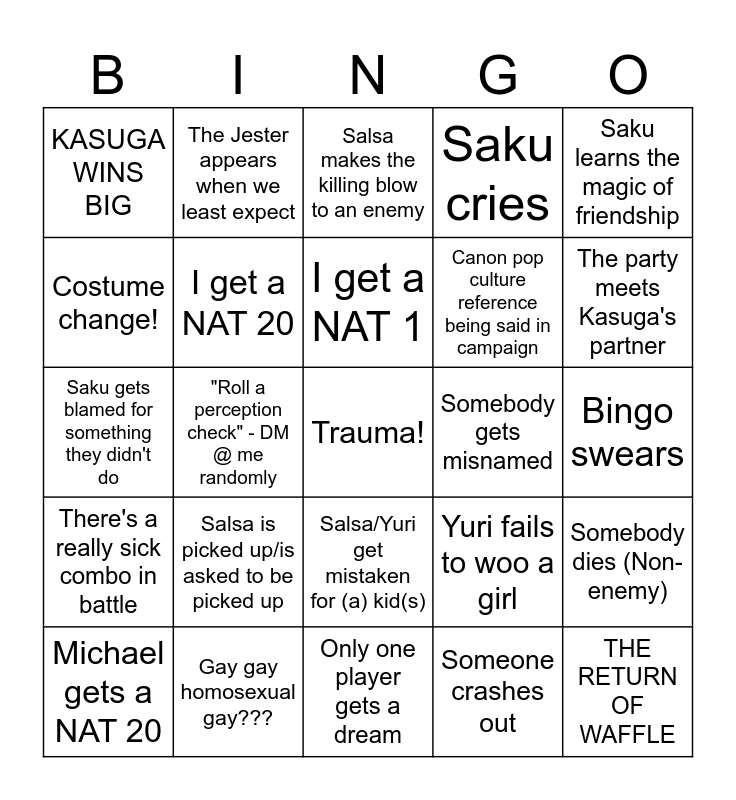 This bingo card has a free space and 24 words: Salsa is picked up/is asked to be picked up, Gay gay homosexual gay???, I get a NAT 1, Michael gets a NAT 20, Saku learns the magic of friendship, KASUGA WINS BIG, Costume change!, The Jester appears when we least expect, Somebody gets misnamed, Salsa/Yuri get mistaken for (a) kid(s), Canon pop culture reference being said in campaign, Saku gets blamed for something they didn't do, Yuri fails to woo a girl, Somebody dies (Non-enemy), I get a NAT 20, Someone crashes out, Bingo swears, Salsa makes the killing blow to an enemy, The party meets Kasuga's partner, "Roll a perception check" - DM @ me randomly, THE RETURN OF WAFFLE, There's a really sick combo in battle, Saku cries and Only one player gets a dream.
