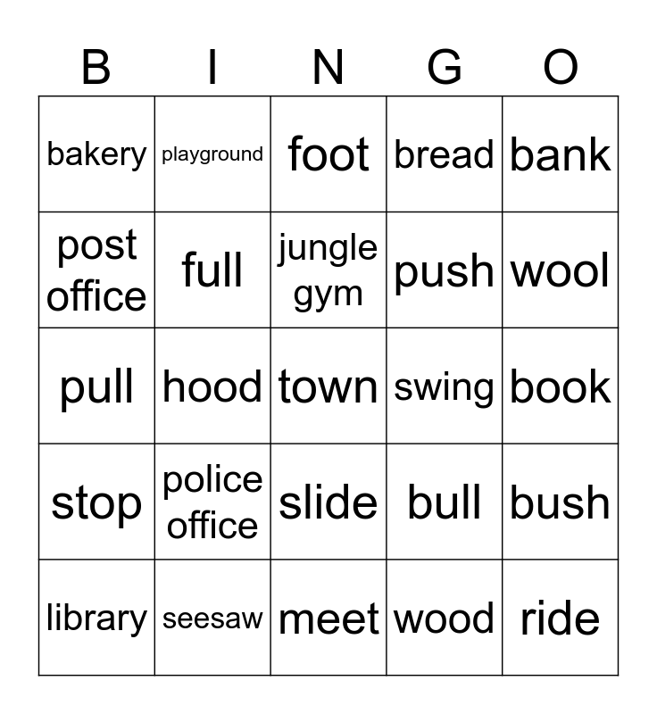 This bingo card has a free space and 24 words: police office, seesaw, jungle gym, library, bank, bakery, post office, playground, swing, slide, push, pull, bull, bush, full, wood, book, foot, wool, hood, ride, stop, bread and meet.